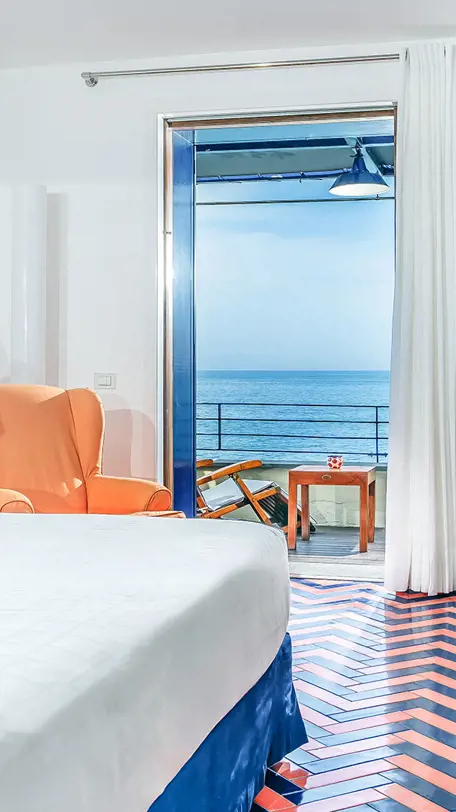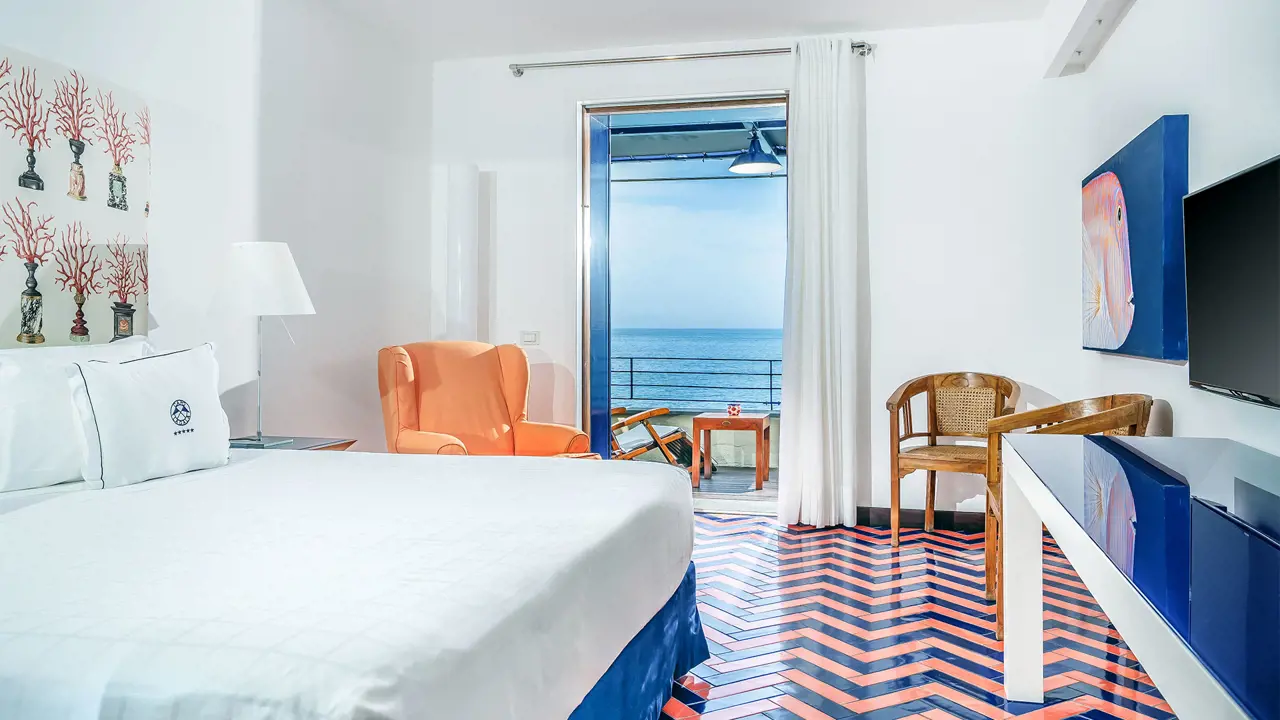 La Camera Corallo, di 28 mq, è dotata di uno splendido terrazzo vista mare ideale per rilassarsi e ammirare gli incantevoli tramonti.